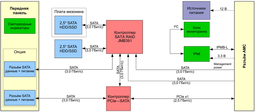 - На переднюю панель модуля могут быть выведены разъёмы для подключения внешних SATA устройств (Опция)