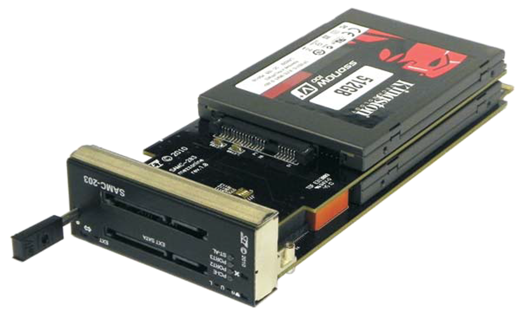 Модуль SAMC-203 выпускается как в базовой, так и в расширенной конфигурации, где на переднюю панель модуля выведены два стандартных SATA разъёма (данные + питание). С помощью верхнего разъёма SATA модуль можно подключить к любому компьютеру стандартным кабелем SATA. В таком режиме пользователю будут доступны все режимы RAID, работа модуля ничем не отличается от работы в составе системы MicroTCA или AdvancedTCA. Нижний разъём SATA позволяет подключать к модулю любые стандартные SATA устройства, например, CD/DVD привод или дополнительный жёсткий диск.