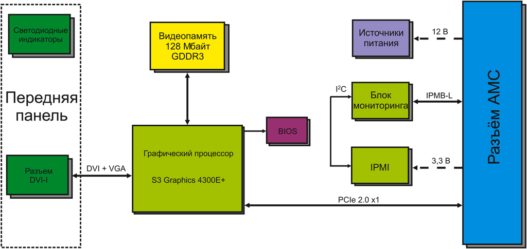 На переднюю панель модуля выведен разъём DVI-I для подключения мониторов как с цифровым DVI, так и с аналоговым интерфейсом VGA.