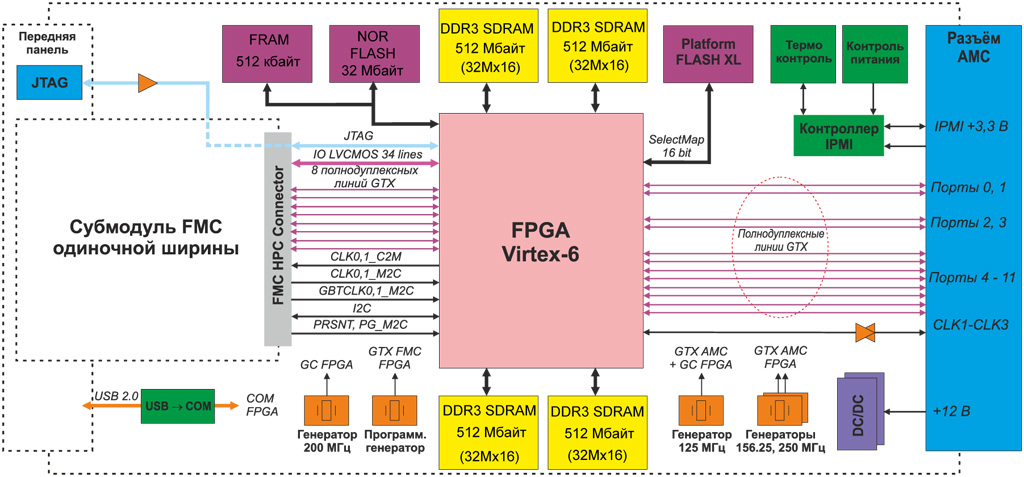 - Поддержка мезонинных модулей FMC с интерфейсом на базе восьми дуплексных линий мульти-гигабитных приёмопередатчиков MGT