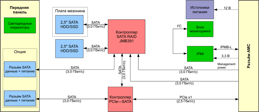 - Возможность подключать к модулю любые стандартные SATA устройства