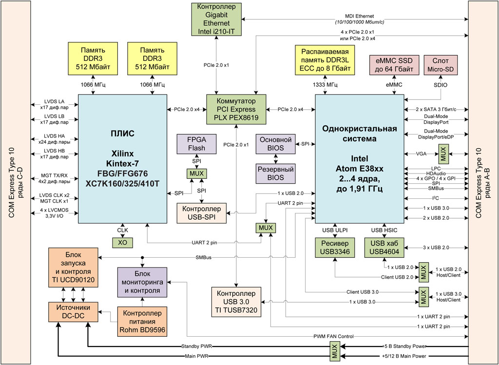 3 Гбит/с , USB 2.0/3.0, SPI, UART, DisplayPort, Intel HD Audio - Интерфейсы разъёма COM Express Extended: LVDS/LVCMOS, MGT