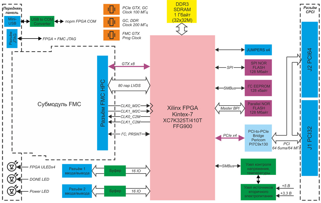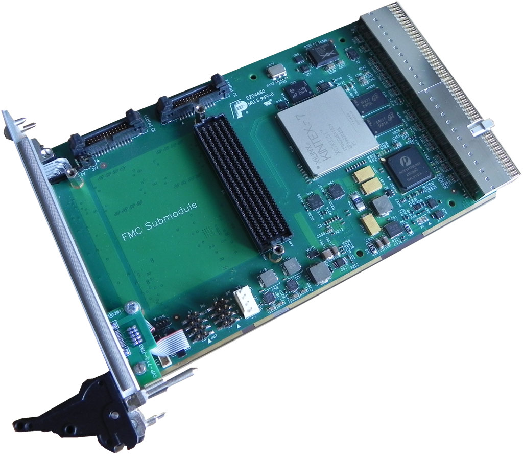 Kintex-7 XC7K325T с поддержкой установки кристалла XC7K410T с производительностью свыше2,8 TMAC/с 32-х разрядный банк памяти DDR3 объёмом 1 Гбайт- Модуль форм-фактора CompactPCI 3U с системным интерфейсом