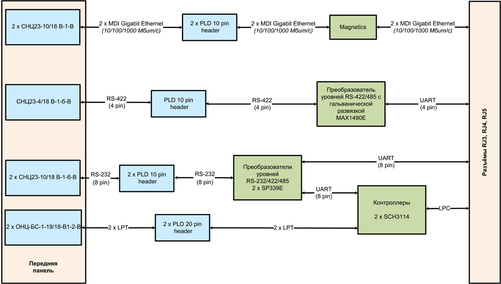 - Интерфейсы модуля выведены на переднюю панель в разъёмы типа