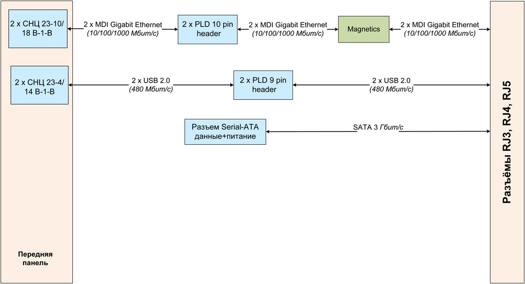 3 Гбит/с - Интерфейсы модуля: Gigabit Ethernet, USB 2.0 выведены на переднюю панель в разъёмы типа СНЦ23
