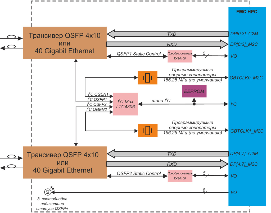 QSFP+ модулю посредством линий I2C FMC. Данные сигналы обеспечивают мониторинг