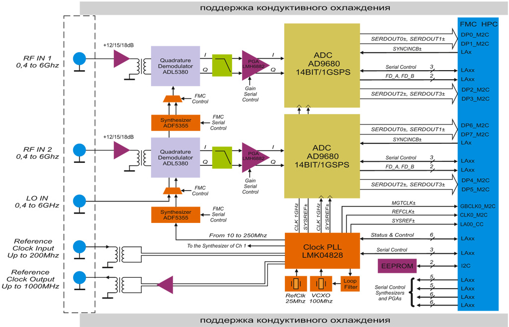Подобная организация трактов наряду с применением сдвоенных микросхем АЦП AD9680 AD позволяет