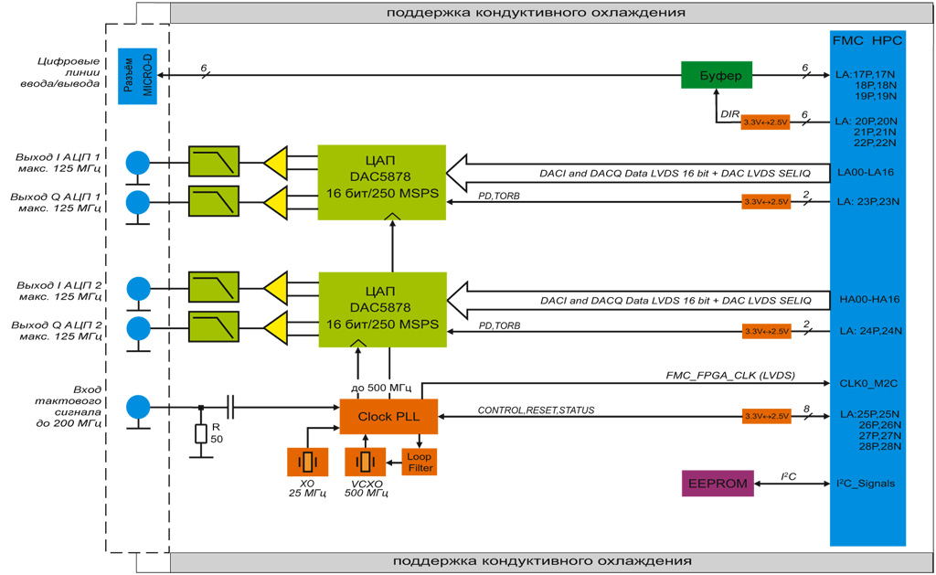 - Поддержка двух каналов ЦАП и цифрового порта в исполнении FMC LPC