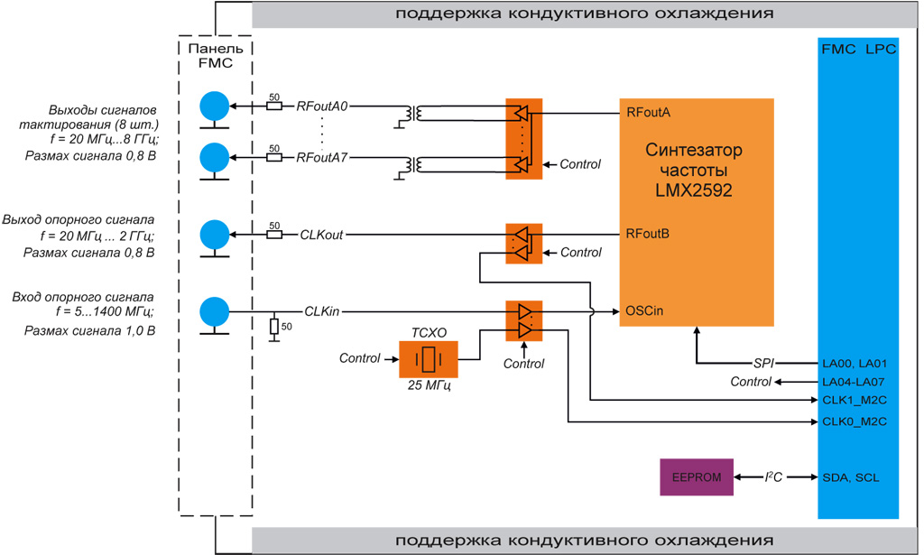 В основе субмодуля лежит синтезатор частоты LMX2592 TI с низким уровнем фазового джиттера встроенного ГУН (до 50фс). В качестве источника опорного тактирования может выступать как встроенный высокостабильный термо-компенсированный генератор TCXO Connor-Winfield с номиналом частоты 25 МГц, так и внешний источник опорного тактирования через разъём SSMC передней панели субмодуля в диапазоне частот от 5 до 1400 МГц. Выбор источника опорного тактирования, как и настройка синтезатора частоты, осуществляется программно со стороны несущего модуля через разъём FMC. На субмодуле предусмотрена дополнительная линия FMC контроля частоты источника опорного тактирования.