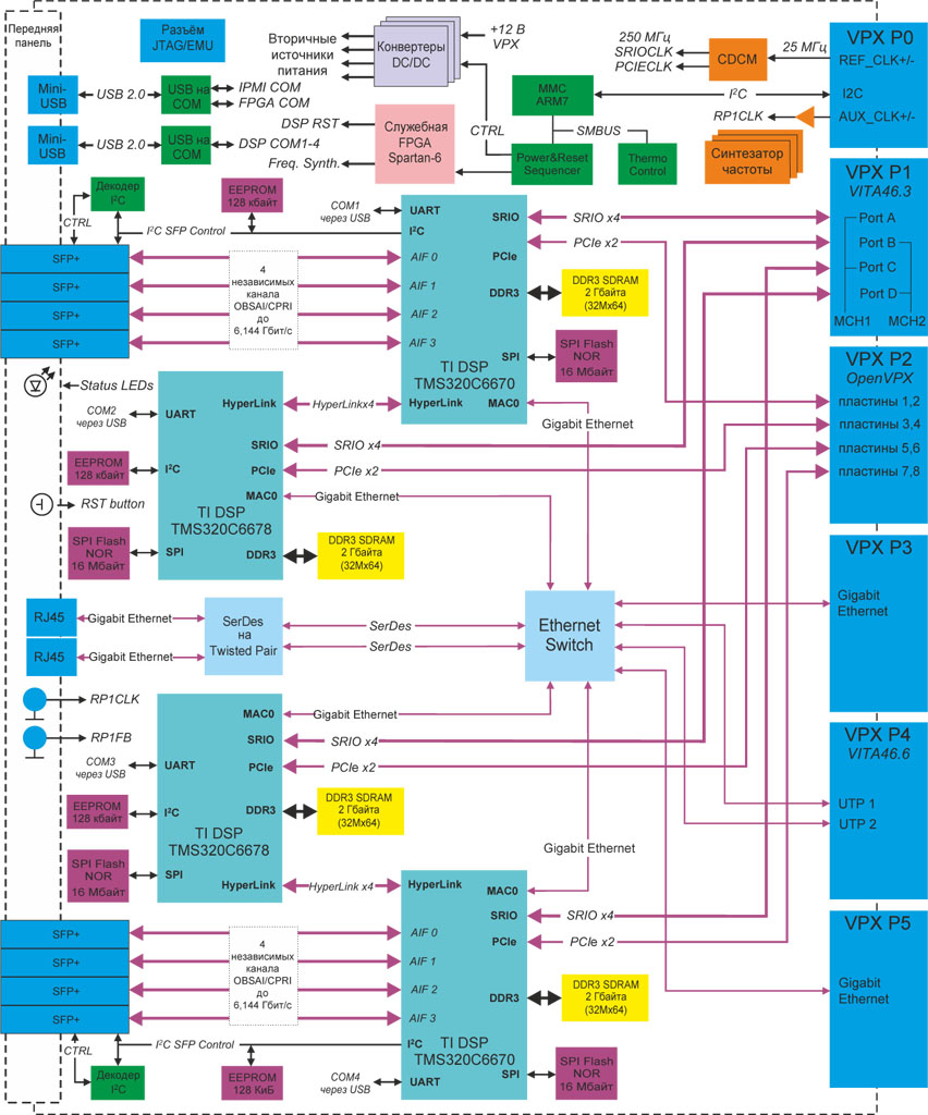 Мощные интерфейсные возможности модуля включают четыре низколатентных канала SRIO x4,