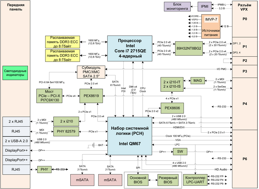 • Контроллер LPC-UART: 2 × RS-232 на разъём VPX P4, Р6 и 1 × RS-232 на передней панели