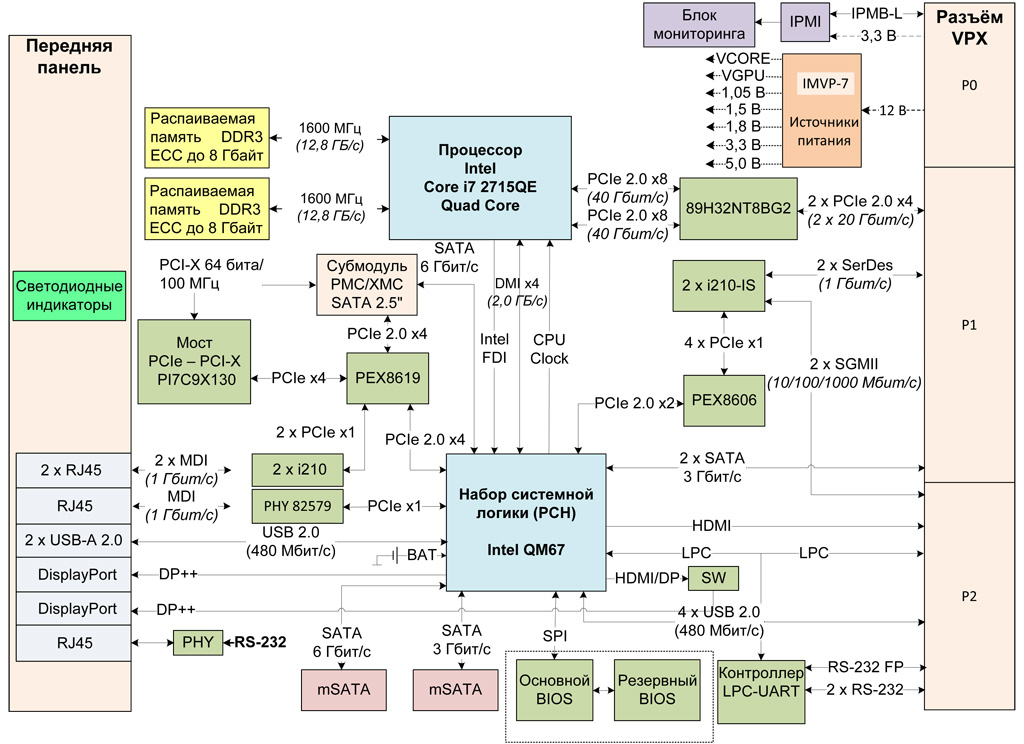 • Коммутатор IDT 89H32NT8BG2: коммутация 2 × PCIe 2.0 x8 от процессора к разъёму VPX P1 (DP1–DP4)