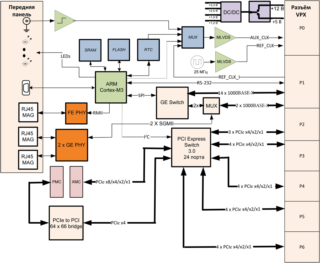 Коммутатор PCIe 1.0/2.0/3.0 осуществляет коммутацию до 19 каналов PCIe x4/x2/x1 модулей VPX, установленных в крейте, а также одного канала x8/x4/x2/x1 установленного на плате модуля PMC/XMC. Поддержка шины PCI/PCI-X на модуле PMC обеспечивается мостом PCIe-PCI. Состояние соединений отображается светодиодными индикаторами.