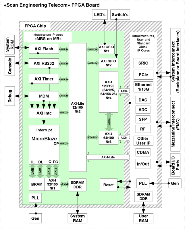 «MBS on MB» позволяет реализовать микропроцессорную систему внутри FPGA модуля. Пользователь может взять соответствующий его типу FPGA модуля готовый проект и дополнить его необходимыми ему функциональными IP-ядрами и инфраструктурами IP-ядер и подключая их к интерфейсным AXI коммутаторам №3 и №4 сформировать свою собственную аппаратную платформу.